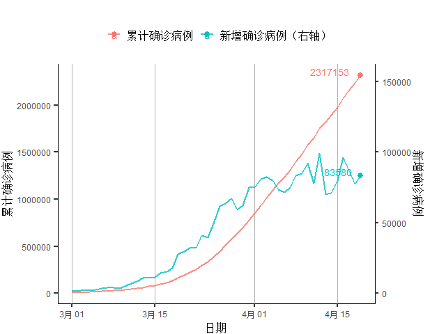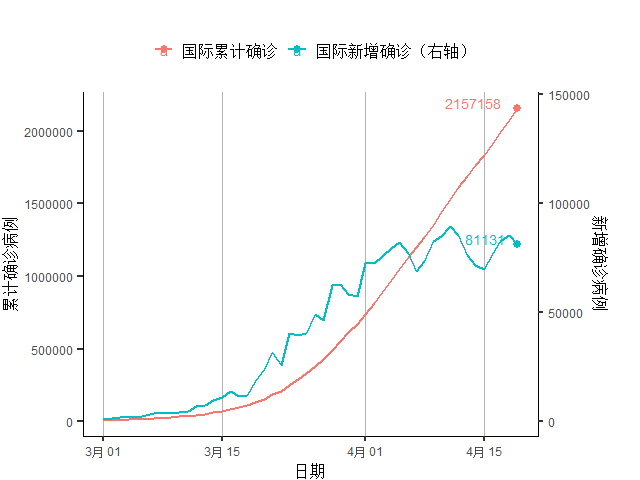 图7 国际确诊与新增确诊人数(约翰霍普金斯大学数据)