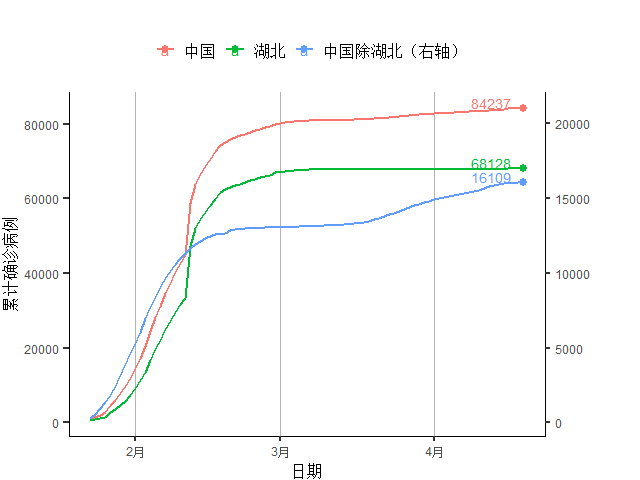 注:4月16日武汉确诊病例数订正导致当日中国新增确诊病例数上升。