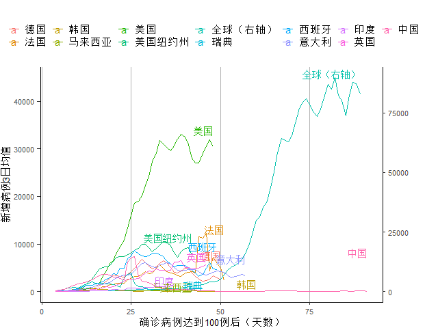 图4 新增确诊病例达到100例后主要疫情国家新增确诊病例增长3日均值