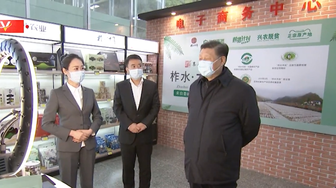 在村培训中心,几位村民正在做网上卖货的准备工作,习近平总书记走到直播平台前,同他们亲切交流。习近平说:“电商,在农副产品的推销方面是非常重要的,是大有可为的。”