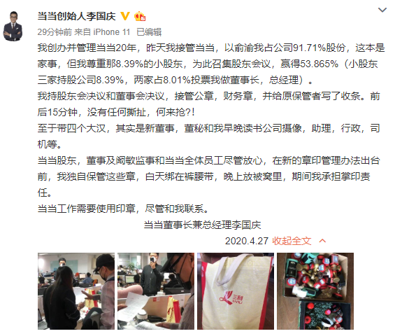 4月27日,当当创始人李国庆在微博发声表示,持股东会决议和董事会决议,接管公章、财务章,并给原保管者写了收条,没有任何撕扯。同时,他表示,在新的章印管理办法出台前,将独自保管这些章。