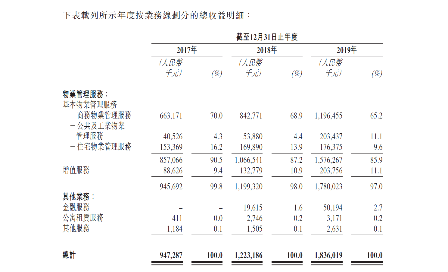 招股书显示,公司收入从2017年的人民币9.47亿元增至2019年的人民币18.36亿元,复合年增长率约为39.2%。其中商务物业管理收入11.96亿元,占总收入65.2%。