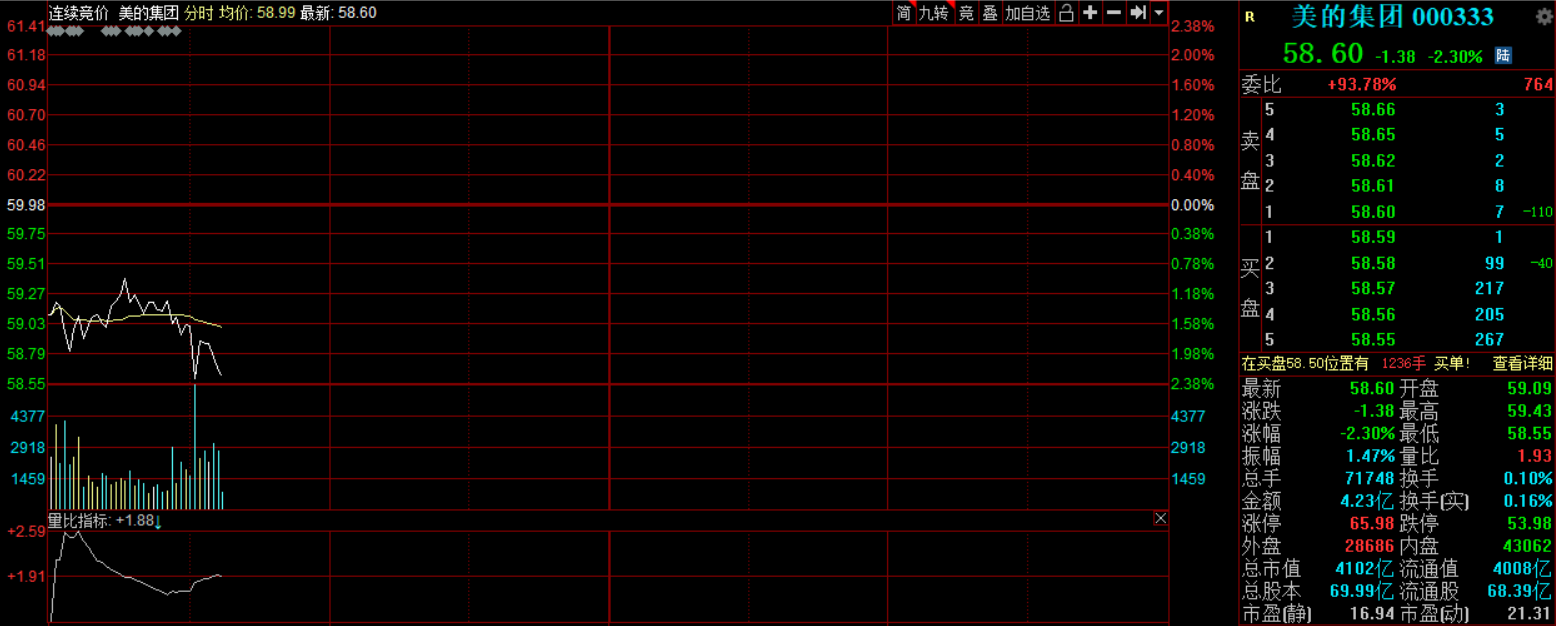 6月15日,美的集团早盘小幅下挫,截至发稿,公司股价跌2.3%,报58.6元。