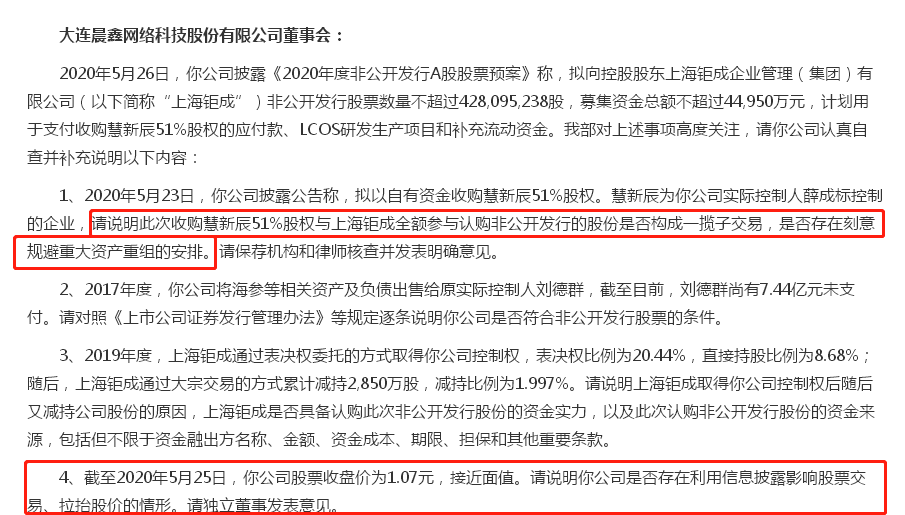 6月2日,公司回复表示,两项交易是独立的交易,并非一揽子交易;非公开发行股票并非仅为支付收购慧新辰股权的应付款。