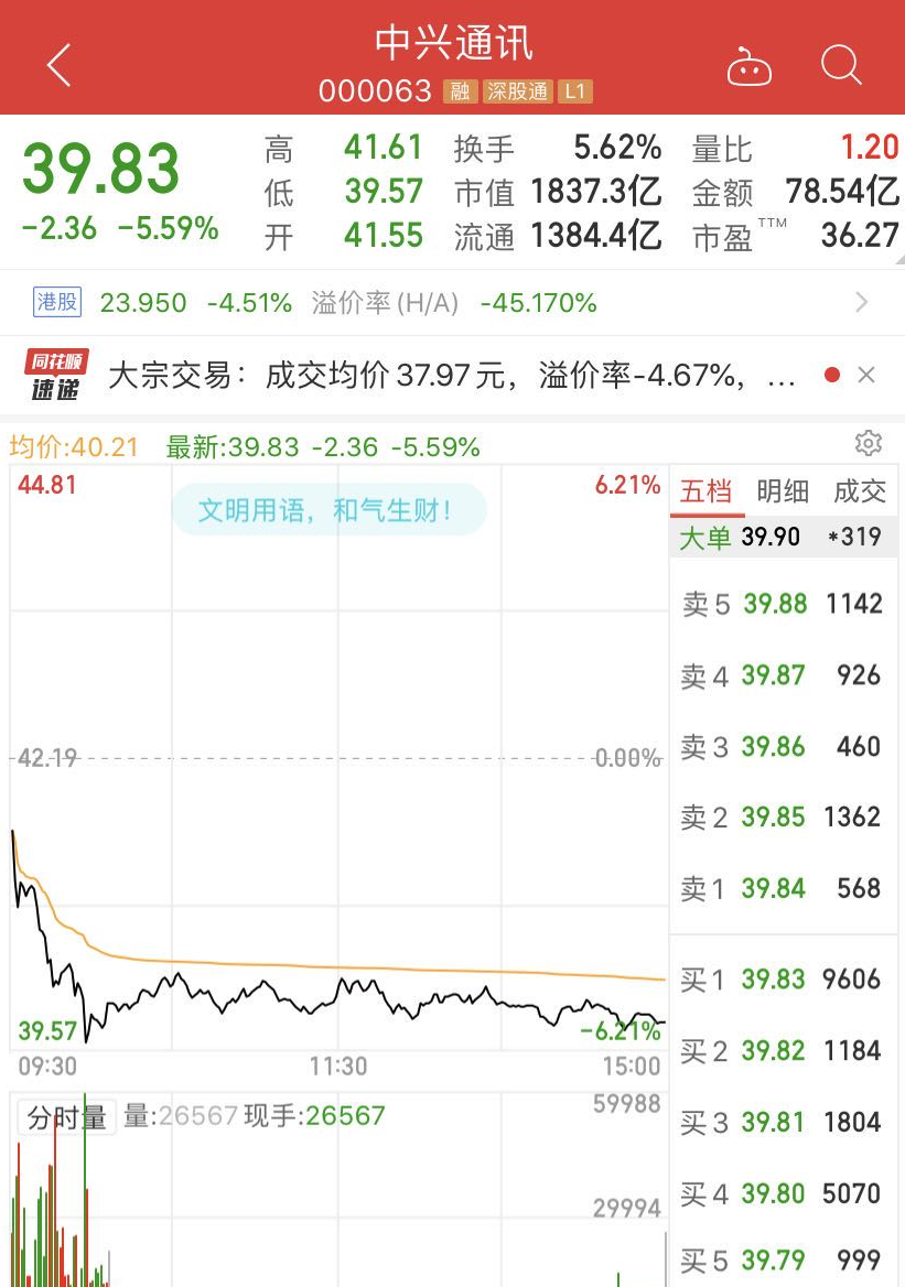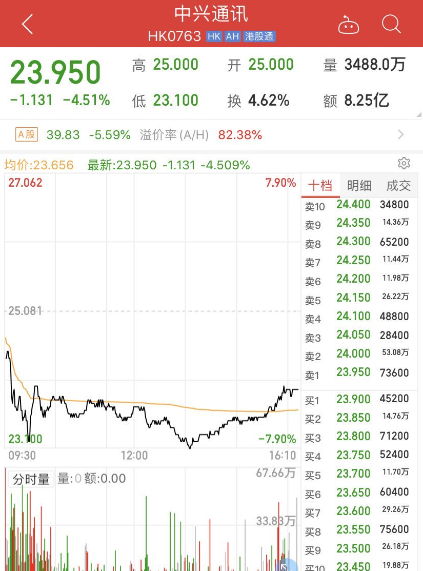 控股股东折价减持套现8亿元,6月23日,中兴通讯(000063.SZ)A股、H股大幅受挫,其中A股下跌5.59%,收报39.83元;H股跌4.51%,收报23.95港元,盘中一度下挫逾7%,A+H股合计市值蒸发逾90亿元。
