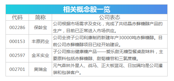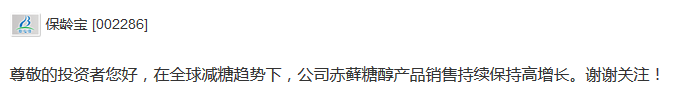 公司互动平台上表示,在全球减糖趋势下,公司赤藓糖醇产品销售持续保持高增长。