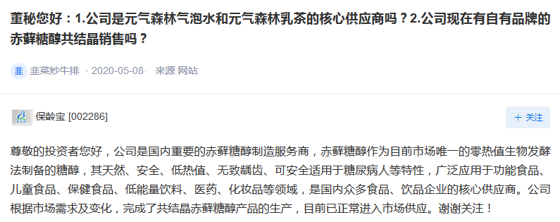 而值得注意的是,当投资者问及公司的赤藓糖醇是否在元気森林饮料中使用时,保龄宝并未作出正面回应。