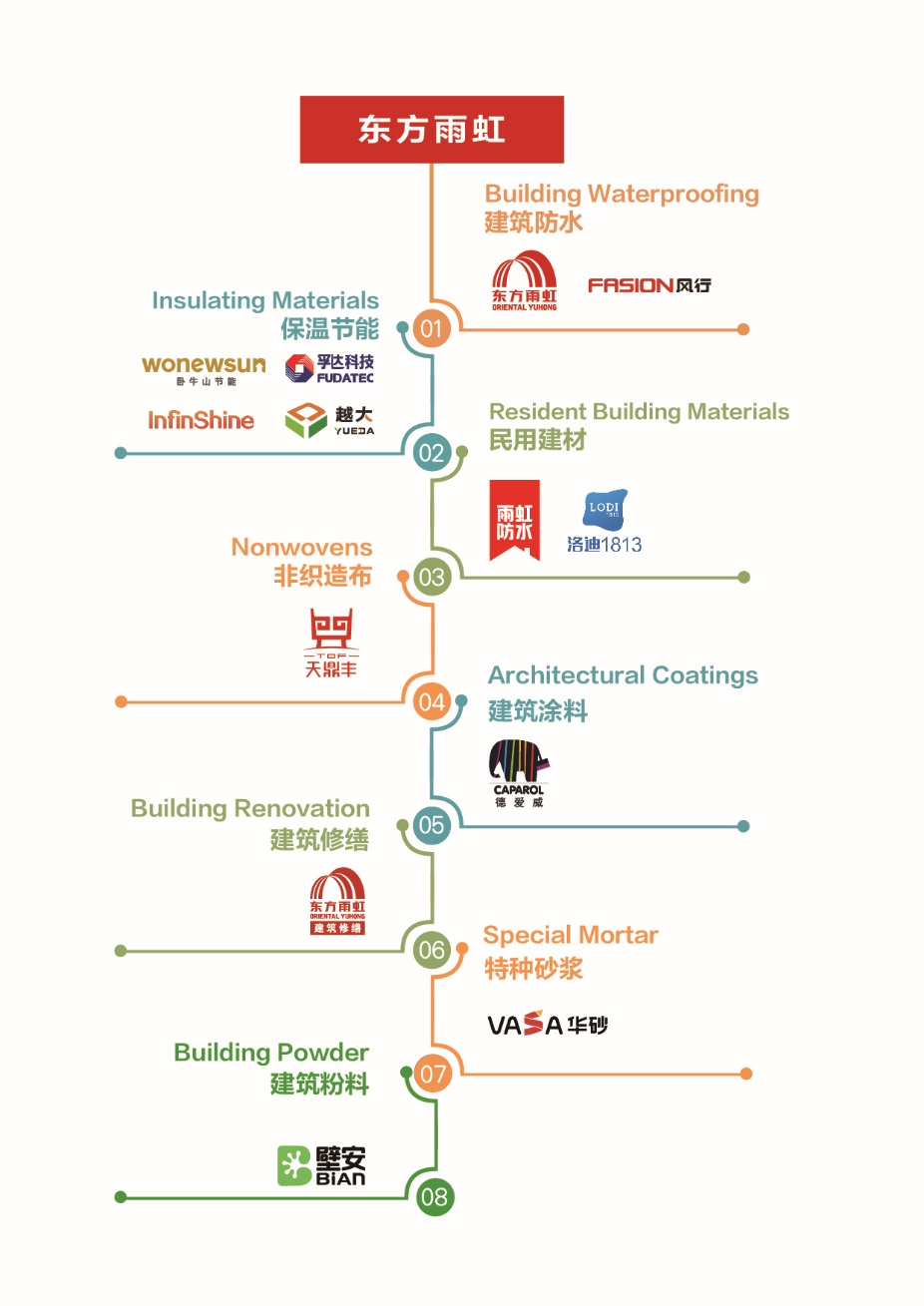 身处行业环境的变化中,只有不断地适应和演化自身的业务,才能获得持久的成长。东方雨虹成立于1995年,围绕建筑建材行业不断进行深耕,提升产品质量,扩大服务半径,以主营防水业务为核心延伸上下游及相关产业链,逐步形成建筑防水、民用建材、非织造布、建筑涂料、建筑修缮、节能保温、特种砂浆、建筑粉料等业务板块合力的建筑建材系统服务体系。
