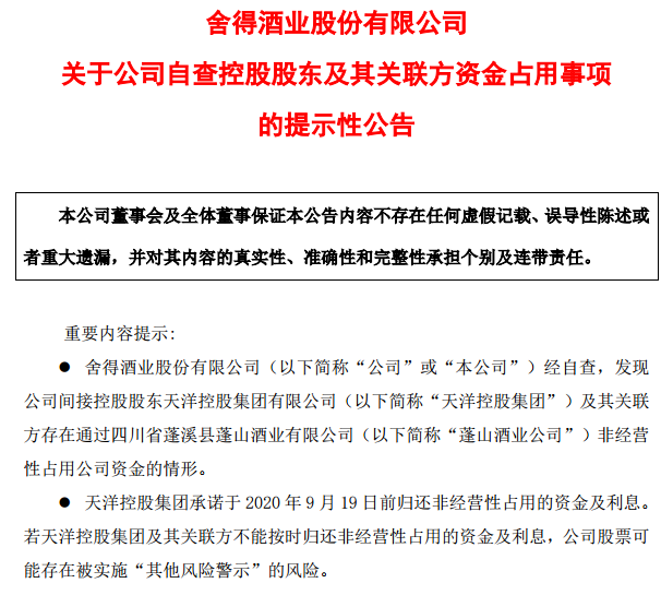 若上述关联方未能于2020年9月19日前归还非经营性占用的资金及利息,舍得酒业股票可能存在被实施“其他风险警示”的风险。
