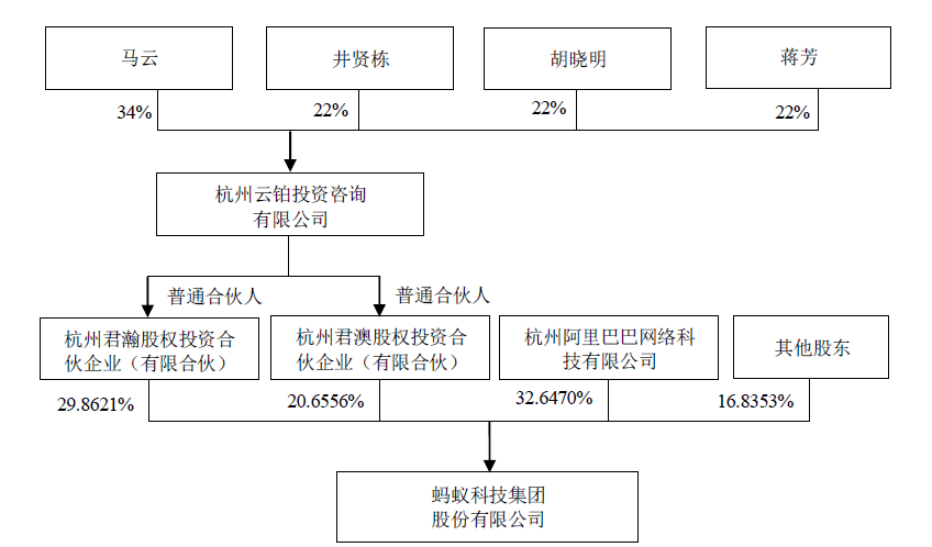 招股说明书披露了其最新的股东构成,截至发布之日,君瀚、君澳作为蚂蚁集团的员工持股平台,分别持有蚂蚁集团29.8%和20.6%的股份,为控股股东。发行完成后,君瀚、君澳合计持股将不低于40%。