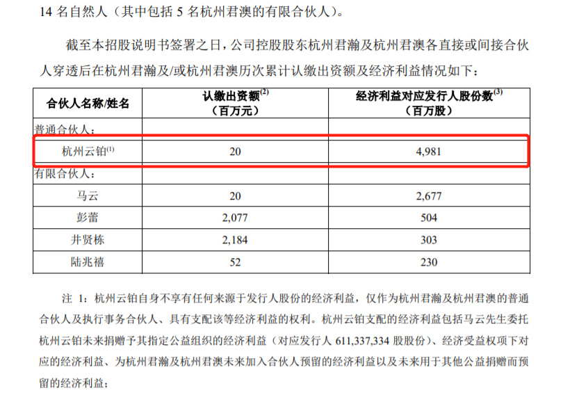 马云个人持有26.77亿股蚂蚁股份,意味着上市后的持股比例不超过8.8%。此外,马云还宣布捐出其持有的6.1亿股蚂蚁股份,委托杭州云铂未来捐赠给他指定的公益组织。按招股书显示的上市后总股本300.3897亿股计算,马云此次相当于捐出了蚂蚁集团上市后2%的股份。