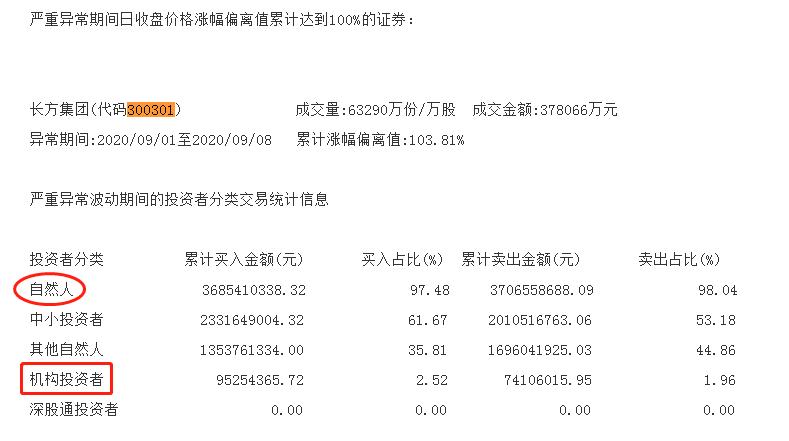 与此同时,深交所披露,长方集团在9月1日至9月8日涨幅严重异常期间,获自然人累计买入36.85亿元,占比97.48%;其中,中小投资者累计买入23.32亿元,占比61.67%,机构投资者买入占比2.52%。