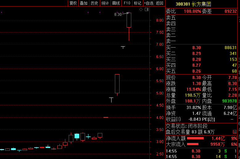 盘面上,长方集团今日以涨停报收,收报于8.30元,为连续5个交易日涨停,5个交易日股价涨幅147.8%。