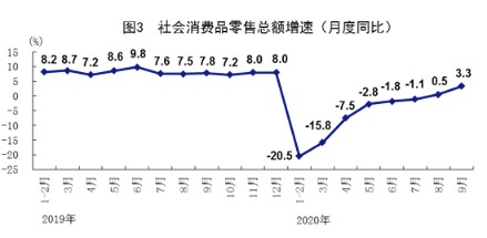 2、社会消费品零售总额虽然同比下降了7.2%,但降幅比上半年收窄4.2个百分点。特别是三季度增长0.9%,实现了季度增速正式转正。
