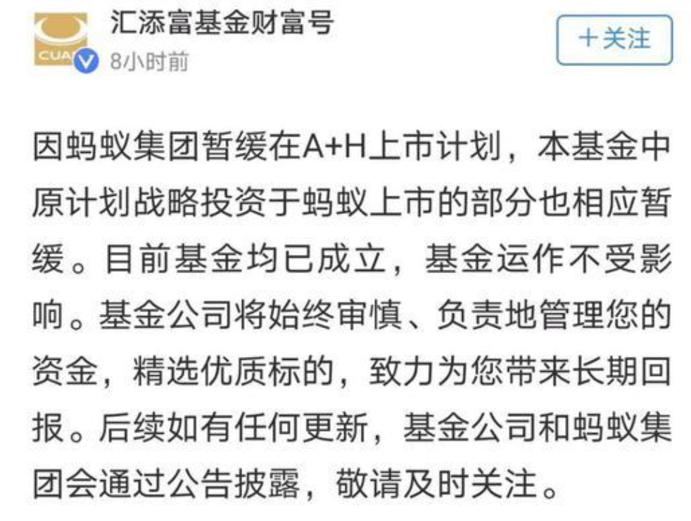 易方达基金、华夏基金、中欧基金、鹏华基金、汇添富基金也纷纷发出公告表示,因蚂蚁集团暂缓在A+H上市计划,创新未来基金中原计划战略投资蚂蚁上市的部分也相应暂缓。目前基金均已成立,基金运作不受影响。基金公司将始终审慎、负责地管理您的基金,精选优质标的,致力为您带来长期回报。