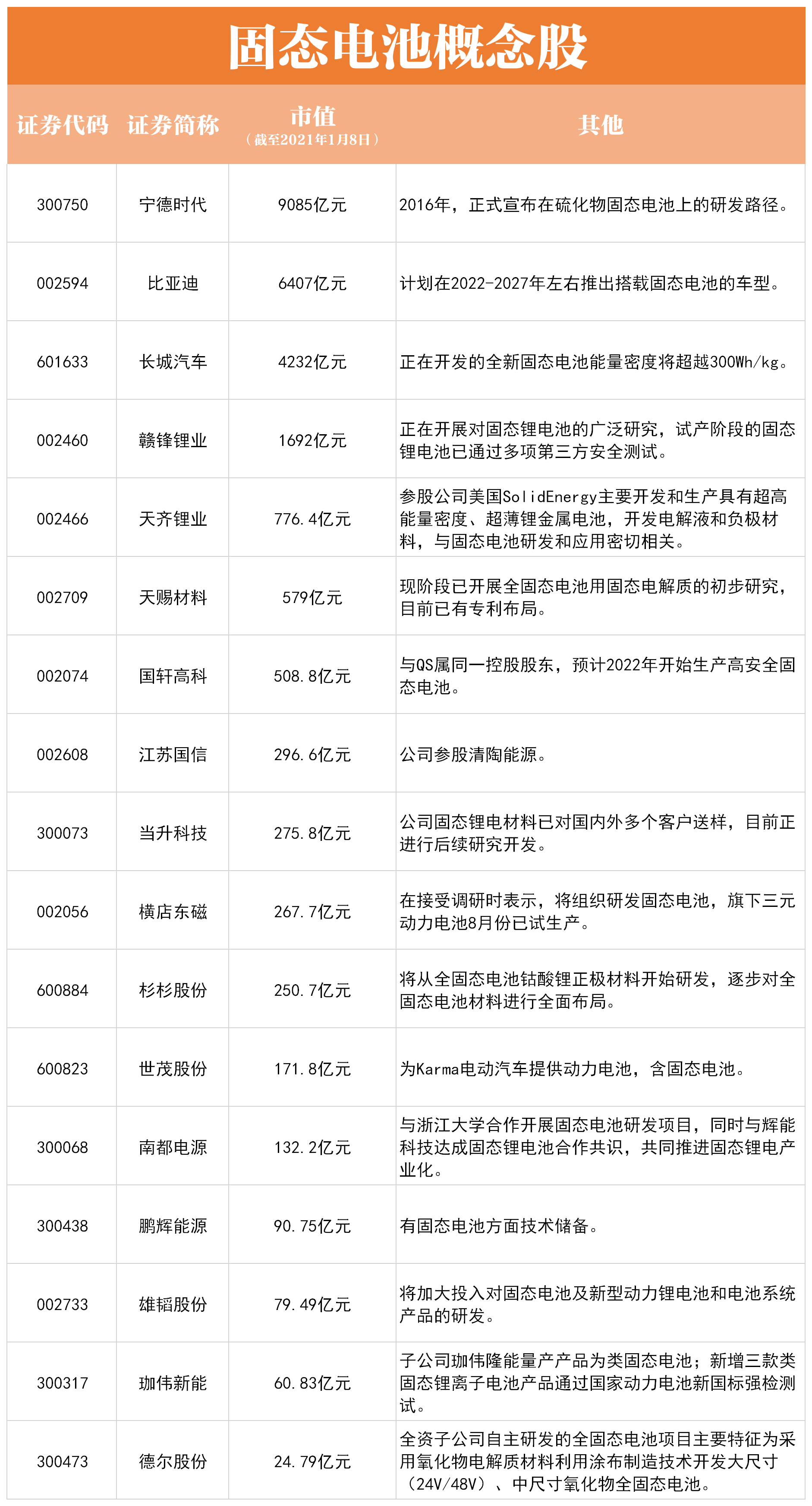 目前,全球车企和电池企业等都在积极布局固态电池。A股市场上,宁德时代、比亚迪、珈伟新能、赣锋锂业等都在积极发力固态电池的研发。
