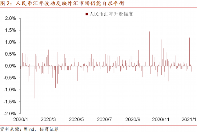 从国内因素来看,企业偿还负债的购汇进程结束,机构对外投资的行为仍受监管约束。随着汇率预期稳定,中国居民和企业仍有配置海外资产的需求,此前过分抑制购汇需求的外管政策逐步放松,我国外汇市场供求趋向均衡,这是央行减少干预外汇市场的基础。而推行汇改以及使人民币汇率由市场供求决定是央行退出常态式干预的出发点。在双方面因素影响下,2018-2020年央行外汇占款的年度变化分别为-2232、-239、-680.5亿元,近两年月均变化为-20至-60亿元,合不到-10亿美元,规模很小,因此可以认为外汇占款处于0附近的月度波动水平,不再对央行的货币投放产生影响。
