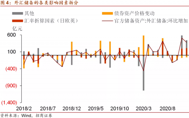 我们对其中的汇率折算因素、债券资产价格变动做出一些估算,但对于其他部分难以准确估算,而其他部分的规模方面,2018年、2019、2020年的月度均值分别为2、-39、-36亿美元,表明在排除了汇率波动和债券资产价格变化之后,外储的月度变化规模较小。