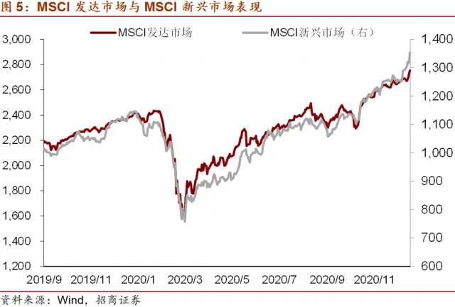 11月、12月在扣除了汇率波动和债券资产价格的波动之后仍然有较大的规模增长,我们猜测权益资产价格的上涨或有一定贡献。以2020年为例,2月、3月MSCI发达国家指数分别下跌-8.6%、-13.5%,MSCI新兴指数分别下跌-5.3%、-15.6%,2、3月外储均有较大规模的不可解释的下降,4月市场转涨后,外汇储备也出现了“额外”的上涨;11月、12月美国大选落地后,MSCI发达国家指数分别上涨12.7%、4.1%,MSCI新兴指数分别上涨9.2%、7.2%,而这两个月外储均有较大规模的不可解释的上升。