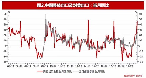 防疫领先强化了我国经济复苏的力度和持续性。过去一年,美欧等国家疫情形势处于持续恶化中,经济活动在“封锁-开放”之间反复摇摆,供应链受到极大破坏。我国经济率先恢复,承接了海外因供应链破坏而外溢的需求,出口尤其是对美出口强劲增长。中国整体出口和对美出口当月同比增速,分别从2019年底的+6.3%和-14.2%,大幅反弹至2020年11月的+25.4%和+46.1%。