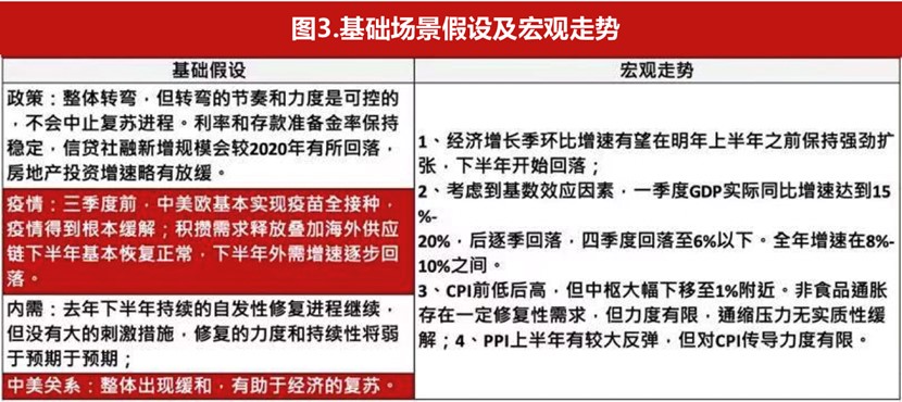 如前面所分析,基础情景下,预计今年国内政策保持基本稳定;疫情得到基本控制;外需逐步回落,内需出现修复性反弹;中美关系基本缓和。在此情景下,经济强劲增长将持续至2021年上半年,然后逐步回落,全年增速预计在8%-10%之间;CPI前低后高,波动中枢预计在1%以内,房租等非食品通胀出现一定反弹,但力度不大,无法实质性缓解通货紧缩压力。