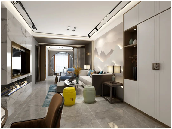 设计师将客厅重新做了布局,以改变电视背景墙的方向为主,原本在进门一侧的背景墙,改到对面。这样的改动,可以用电视背景墙遮挡住卫生间,起到了隐私作用。沙发背景墙,采用山峦水墨画造型,与玄关的水波造型相呼应。电视背景墙采用了石材半挑空设计,这样空间就不会很闷,起到了隔而不断的空间连贯作用。