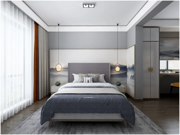 主卧净宽4.3m,主卫宽度约1.9m,将主卧与主卫衔接的空间处,增加了衣帽间。同时,主卧做圆形造型,会增加空间视觉深度。与客厅、餐厅的圆弧元素相呼应。