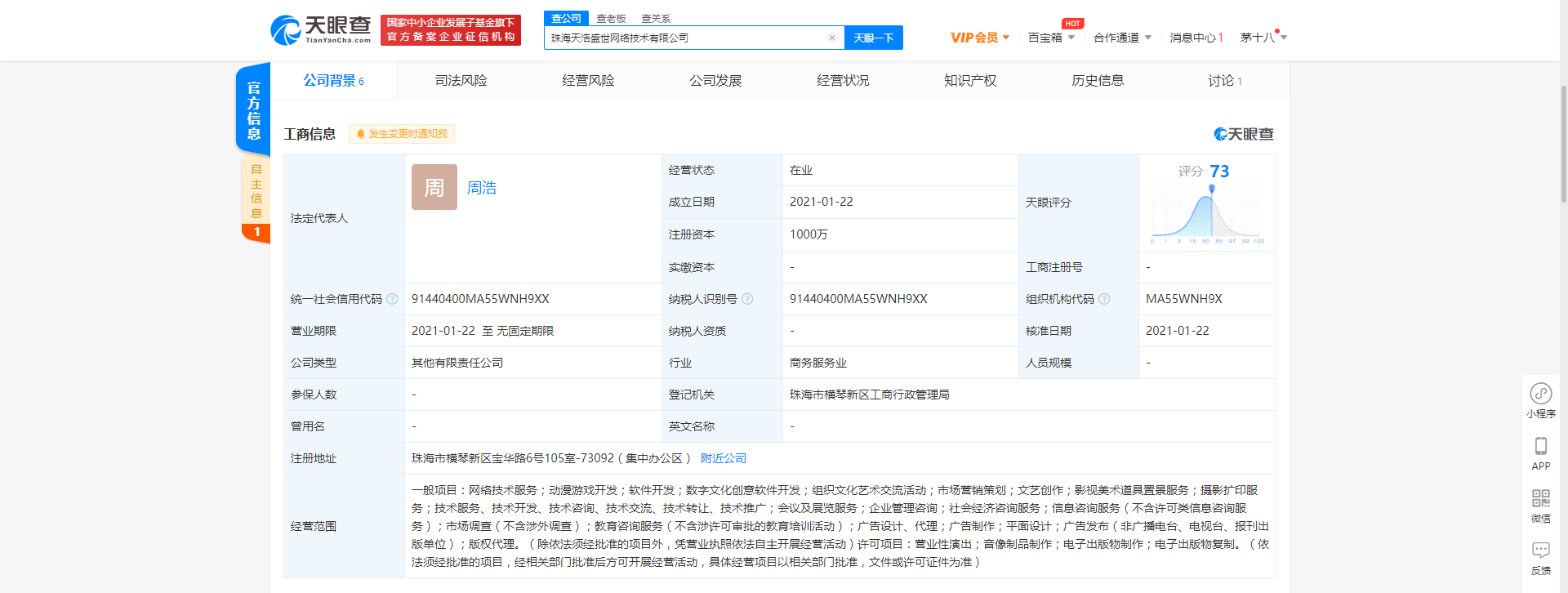 天眼查App显示,2021年1月22日,珠海天浩盛世网络技术有限公司成立,该公司注册资本1000万,法定代表人为周浩,经营范围包括市场营销策划;文艺创作;影视美术道具置景服务;营业性演出;音像制品制作;电子出版物制作;电子出版物复制等。