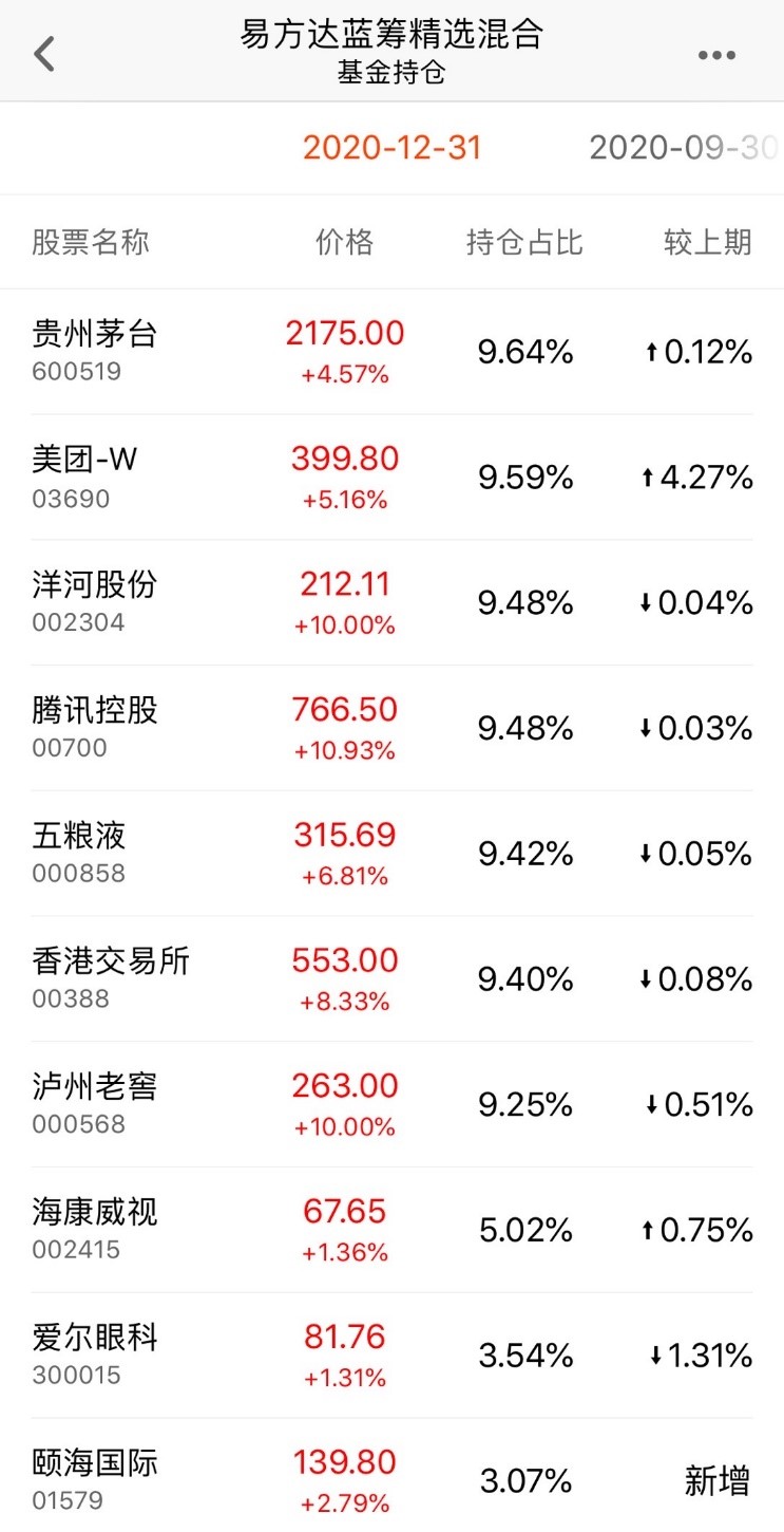 2020年四季度末,易方达蓝筹精选混合投资股票的金额占基金总资产比例的91.12%,前十大重仓股分别为贵州茅台(600519.SH)、美团-W(03690.HK)、洋河股份(002304.SZ)、腾讯控股(00700.HK)、五粮液(000858.SZ)、香港交易所(00388.HK)、泸州老窖(000568.SZ)、海康威视(002415.SZ)、爱尔眼科(300015.SZ)、颐海国际(01579.HK)。