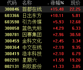 周二午后,快手概念股直线拉升,截至发稿,首都在线涨超15%,日出东方涨超10%,引力传媒涨近6%,蓝色光标、因赛集团、中文在线等纷纷跟涨。