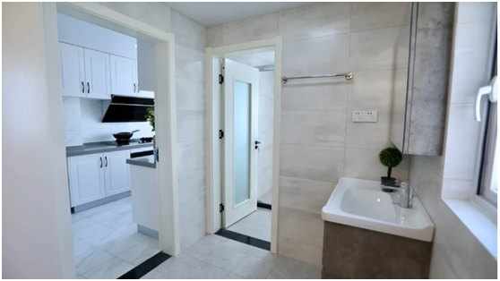 厨房的开门方向由原本的东侧改成了北侧,将过道纳入厨房,调整之后动线更为顺畅,增加了使用面积,U型厨房的洗-切-炒的黄金三角动线也更为合理。