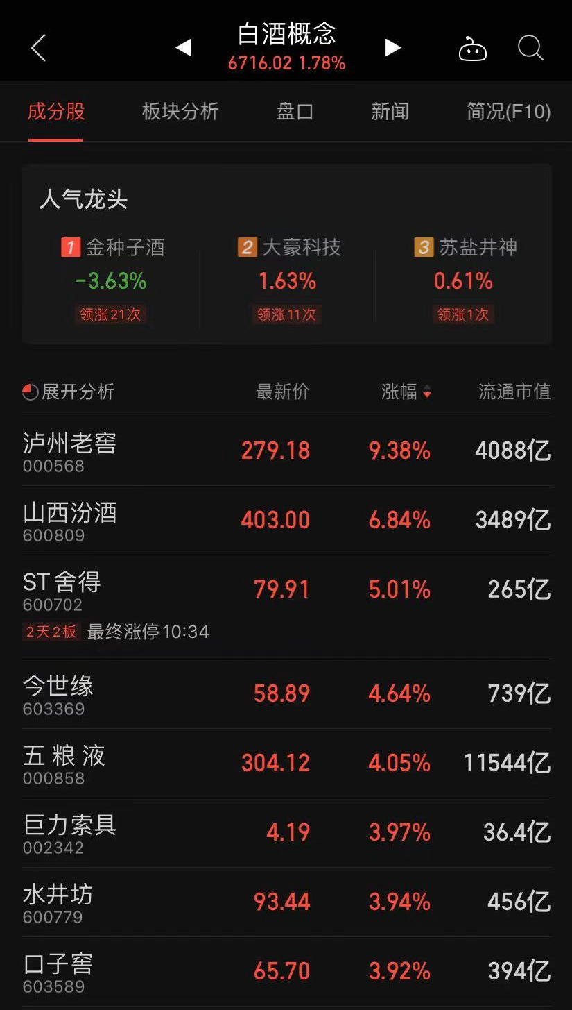 尽管指数回暖,但个股的盘面表现却是分化加剧。具体来看,白酒再掀高潮,泸州老窖(000568.SZ)大涨超9%、山西汾酒(600809.SH)涨近7%,今世缘(603369.SH)、五粮液(000858.SZ)等股均有活跃表现。