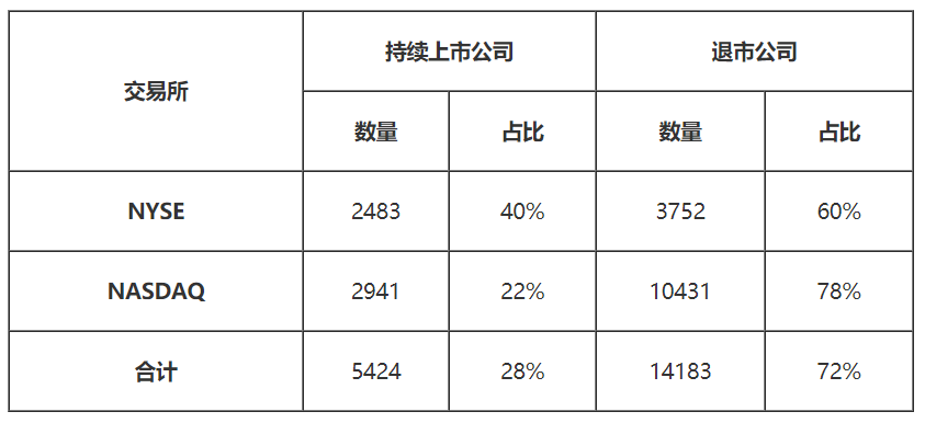 美国股市场是全球股票市值规模最大的资本市场,同时也是全球退市规模最大的资本市场。WRDS数据显示,1980年至2017年,美股上市公司数量累计达到26505家,退市公司达到14183家,退市公司数量占到全部上市公司的54%,其中,纽交所退市3752家,纳斯达克退市10431家;剔除6898家存续状态不明的公司后,退市公司数量占到剩余19607家上市公司的72%。