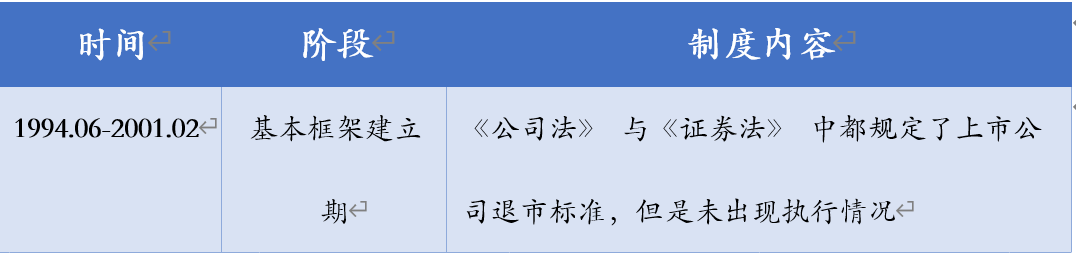 在1994年至2001年期间,受限于为国有大中型企业融资、帮助其脱困的政策定位,以及地方政府的阻力,我国资本市场在此期间未有一家企业退市,退市制度未能真正发挥作用,但不可否认的是,我国通过颁布一系列法律法规和上市规则为退市制度搭建了基本的法律框架、奠定了法律基础。