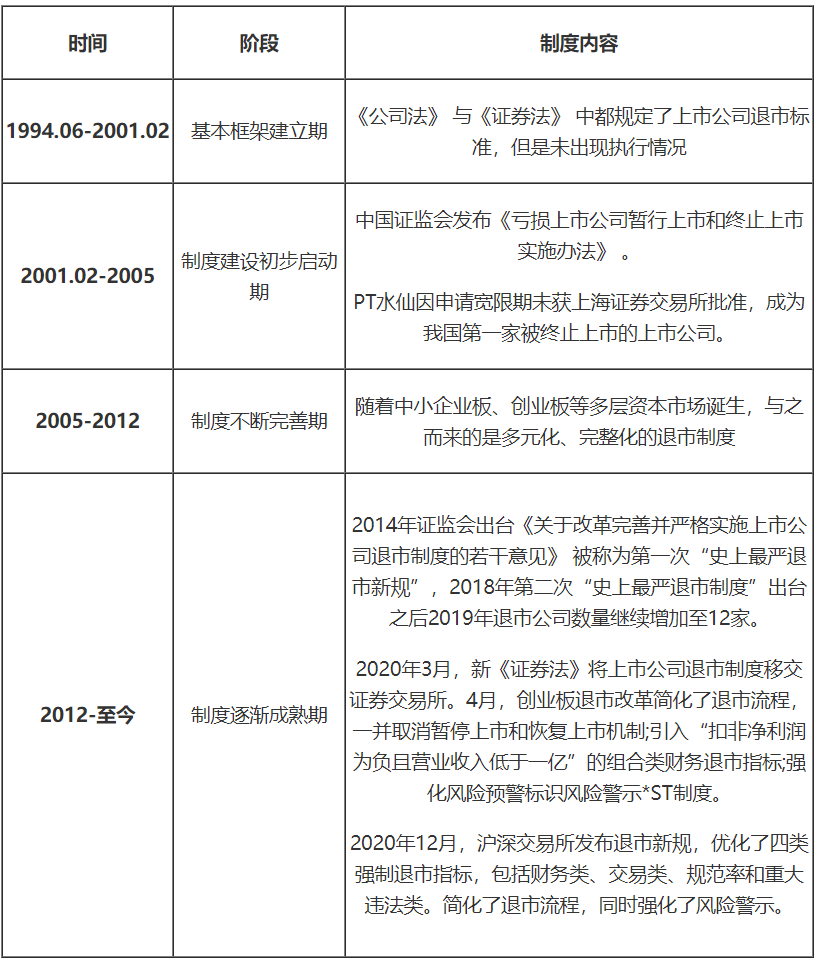 中国资本市场退市制度演变大体可以分为四个阶段,分别是基本框架建立期(1994.07—2001.02)、制度建设初步启动期(2001.02—2005)、制度不断完善期(2005—2012)和逐渐成熟期(2012—至今)。