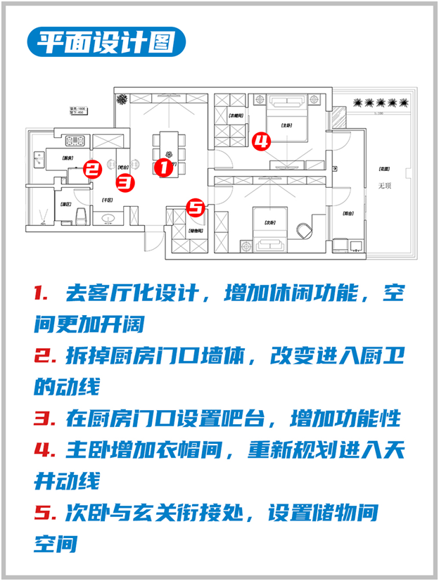 结合业主需求和房子本身的问题,设计师准备从解决厨卫空间混用、改变空间布局引入采光、改变主卧动线增加隐私性、增加收纳功能,这几个方面做重点改造。