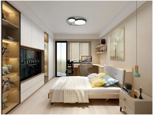 次卧的亮点在于储物和展示,除了电视背景墙的杂物收纳之外,进门处还有顶天立地的衣柜,保证孩子的隐私性和独立性。