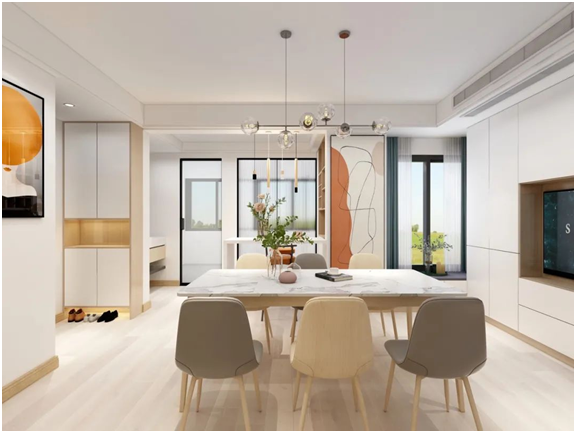 设计师采用了去客厅化设计,不是不要客厅,而是将原本客厅的会客功能弱化,增强用餐等功能。拆掉原本厨房门口的墙体,改成双移门,解决厨卫共用一个门的问题。