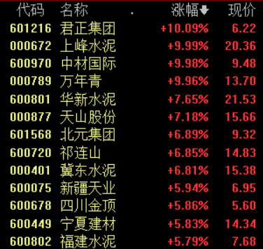 2月19日,水泥板块逆势大涨,截至发稿,君正集团、上峰水泥、中材国际等涨停,华新水泥、天山股份、北元集团等多股走高。