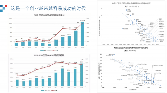 这就把我带到了今天想分享的最后一个话题:为什么今天似乎创业那么容易?为什么几年就可以做成独角兽,甚至千亿万亿?如果我们画一张图,我们会发现原来无论怎样,做成10亿美元的价值都需要很久,从几十年,到几年,到最近的一两年。到底发生了什么?