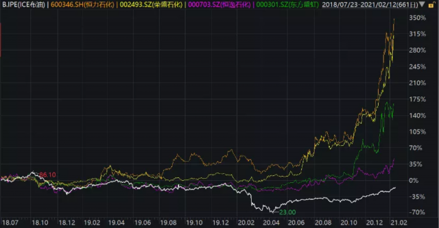 图:荣盛石化、恒力石化、恒逸石化、东方盛虹与原油价格走势