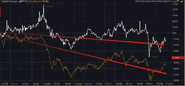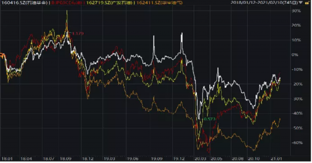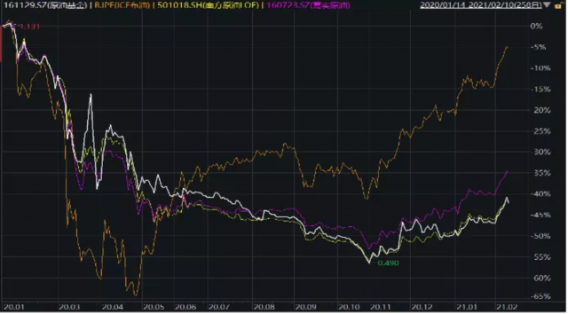 从国内三只商品类原油基金跟踪原油价格效果来看,嘉实原油的跟踪效果相对好些,尤其是2020年11月原油价格回升以来。5~11月份,三只原油基金净值趋势没有随布伦特油价走强,可能原因是三只原油基金持仓的ETF在投资原油期货时,在原油价格远月升水结构下,移仓换月造成的损失,此处不详细展开。