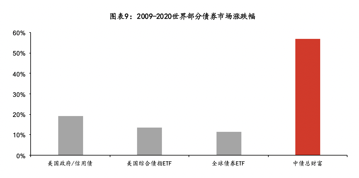 宽松货币环境下,利率中枢持续走低,虽然给存量带来一定的资本利得,但就长期而言,债券市场的整体收益跟随利率下行而减少。过去12年间,美国综合债券指数仅上涨了13%,而全球债券ETF仅上涨了11%,相比之下,经济增速较块、利率更高的中国债券市场收益较高,中债总财富指数上涨57%。