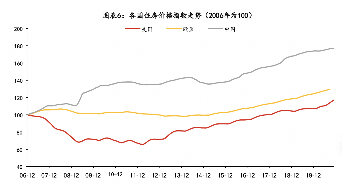 欧美等国受到次贷危机、欧债危机影响,房价先降后升,08年后美国20大中城市平均房价指数上升57%,欧盟房价指数上升24%。中国在08年后整体呈现上升态势,据官方数据统计,中国全国新建商品房平均价格上涨75%。