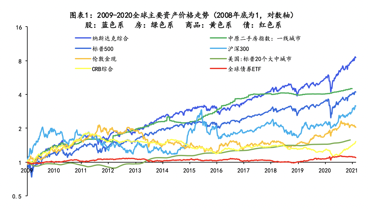 2008年金融危机后,世界主要国家将政策目标利率降至零附近,并实施非常规宽松货币政策,购买以政府债为主的资产,大量投放基础货币、压降长端利率。2020年,新冠大流行再次重创世界经济,美国开启无限量宽松,欧洲、日本等国也相继跟进。回首2008年-2020年,世界主要国家维持了长期的低利率和超额货币供给,在超宽松货币环境下,股票走势领先其他各大传统资产,美股特别是以纳指为代表的美国科技股涨幅最大;住房价格在上升中呈现区域特性,欧美先跌后涨、升幅相对有限,而中国持续上台阶、且一线城市涨幅较大;大宗商品价格中枢有所上移、但受供需影响波动较大;债券市场因利率较低,整体收益最少。