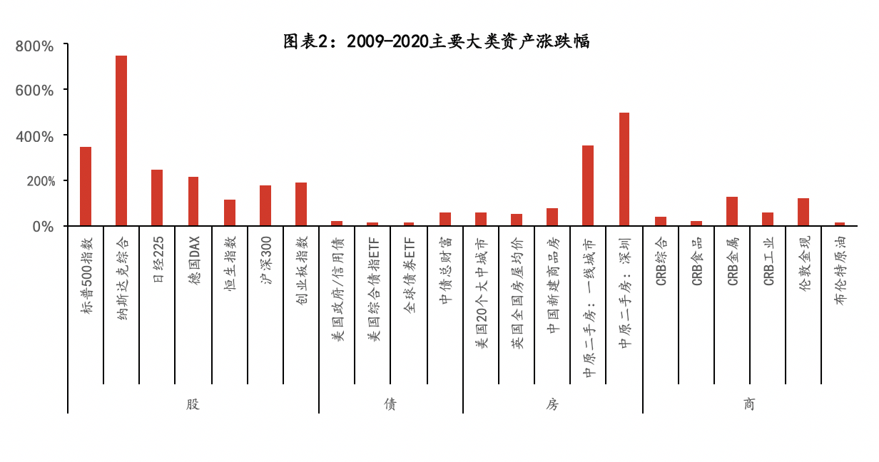 2008年至2020年期间,在传统的股、房、商、债等资产中,股票涨幅领先,多数国家和地区的股指涨幅达到100%-200%,其中美股表现尤为出色,纳指涨幅超过7倍;其次,房价上涨较快,欧美房价受次贷危机影响先跌后涨、平均涨幅在30%-60%,中国房价涨幅较高、平均达75%,且一线城市房价涨幅较大,深圳二手房价格涨幅超5倍;再次,大宗商品有所上涨,CRB综合指数累计涨幅40%,金银、有色等涨幅超1倍;而债券市场收益相对有限,欧美主要债市累计收益不足20%,中国债市收益较高、达50%。