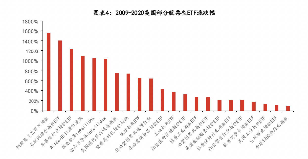 对比全球股市来看,美股涨幅最大,美股内又以科技股领先。过去12年间,美国互联网、半导体、新能源类指数ETF涨幅超过10倍,医疗保健、非必选消费类ETF涨幅超6倍,而工业、必选、金融、材料、零售、消费服务、公用等则相对涨幅较小。