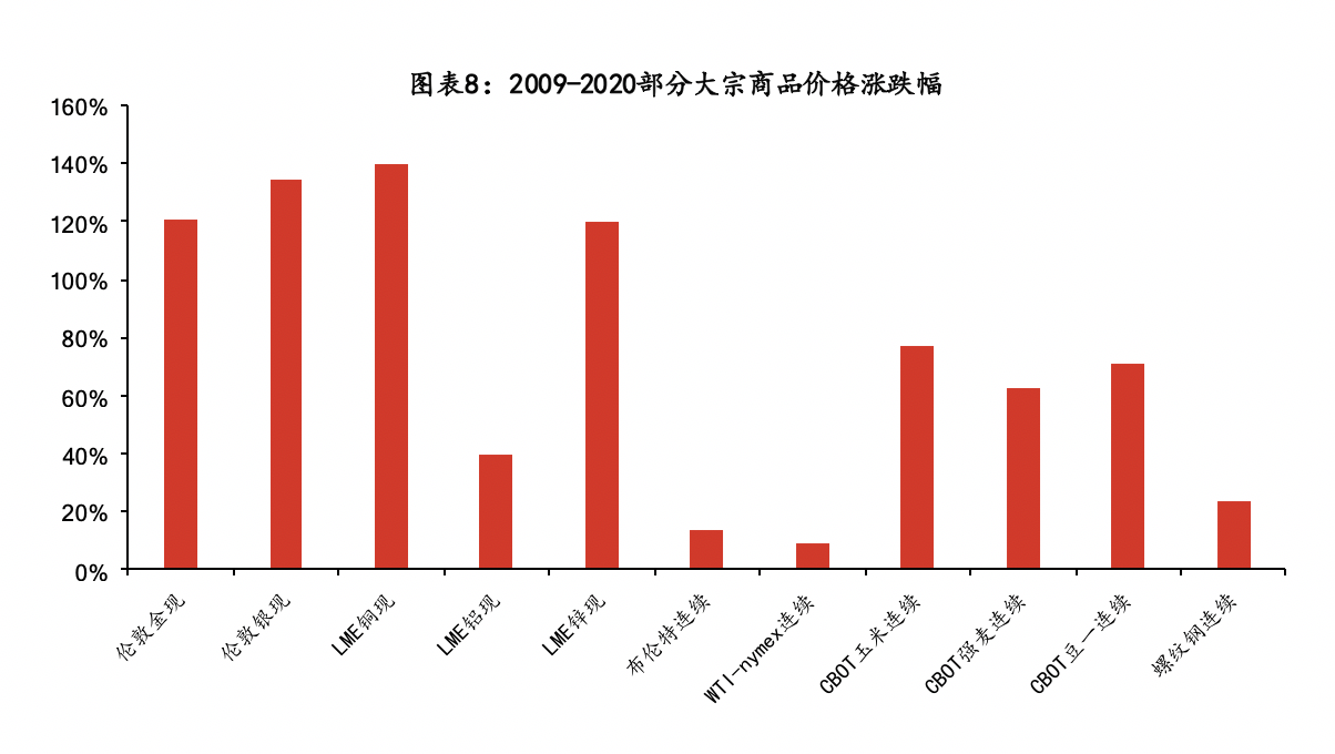 总体来看,股票上涨主要得益于低利率和超量货币供给对估值的推动,此外科技进步对相关行业盈利也有较大拉动;房产同样受益于超宽松货币,缓解的流动性、信用危机,更多的货币供应和名义收入,重启的通胀预期等,均有利于房价走高;大宗商品价格在超宽松货币下中枢上移,但受供需影响波动加大;债市整体收益相对有限,宽松货币环境下利率中枢下行,压低了债市长期的整体收益。