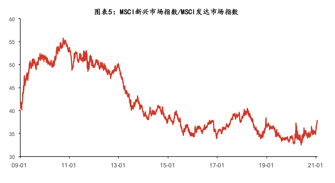 借助“国际储备”和“结算货币”地位,在面对美国国内较低利率环境下,宽松美元向世界流动,推升世界资产价格,且往往首先流向增长更快的新兴市场国家。但08年以来,发达市场股市明显强于新兴市场,MSCI新兴市场指数和发达市场指数的比值持续走低。一方面,宽松货币就像投入湖中的石子,对离它最近的本国市场影响更大;另一方面,数字化浪潮引领的科技进步提供了巨大的盈利动力,而新兴国家相对落后。