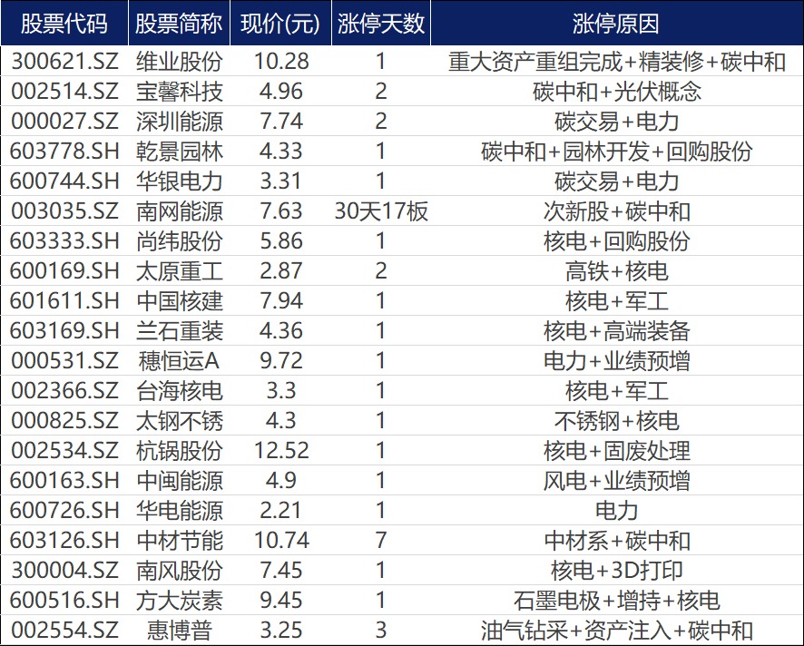 1、碳中和概念继续发酵,核电概念股集体涨停。